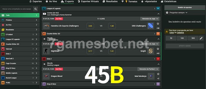O 45B oferece uma grande seleção de opções de apostas em e-sports com probabilidades competitivas